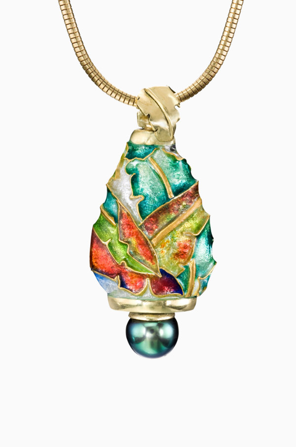 With fellow metal smiths coming together and lending hands to Tom Herman and Patsy Croft, they all created this beautiful cloisonne jewelry piece of 18k gold and fine enamels. This gold enamel jewelry piece is will be auctioned by Sotheby’s in their Majestic Jewels Auction April 17, 2019!